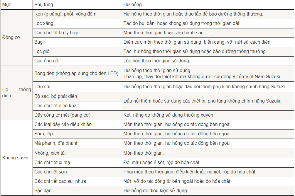 Những trường hợp xe không được bảo dưỡng định kỳ đầy đủ và đúng theo yêu cầu tại các Đại lý ủy quyền của Công ty Việt Nam SUZUKI.
