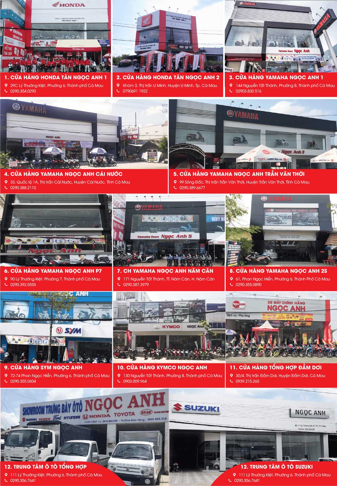 Hiện nay, Ngọc Anh là đại lý chính thức của các hãng xe nổi tiếng như Honda , YAMAHA, SUZUKI, SYM, KYMCO, SUZUKI auto, SYM auto … Ngoài ra, đến với các showroom Ngọc Anh, khách hàng được lựa chọn phong phú các dòng xe máy NHẬP KHẨU, xe Ô TÔ các loại và các dòng xe thịnh hành khác trên thị trường. Đồng thời, Ngọc Anh còn cung cấp dịch vụ sửa chữa và phân phối phụ tùng xe máy chính hãng. Về lãnh vực ôtô, Trung Tâm Auto Ngọc Anh là nơi đáng tin cậy với dịch vụ làm đồng sơn, sửa chữa, và đóng thùng chất lượng cao.